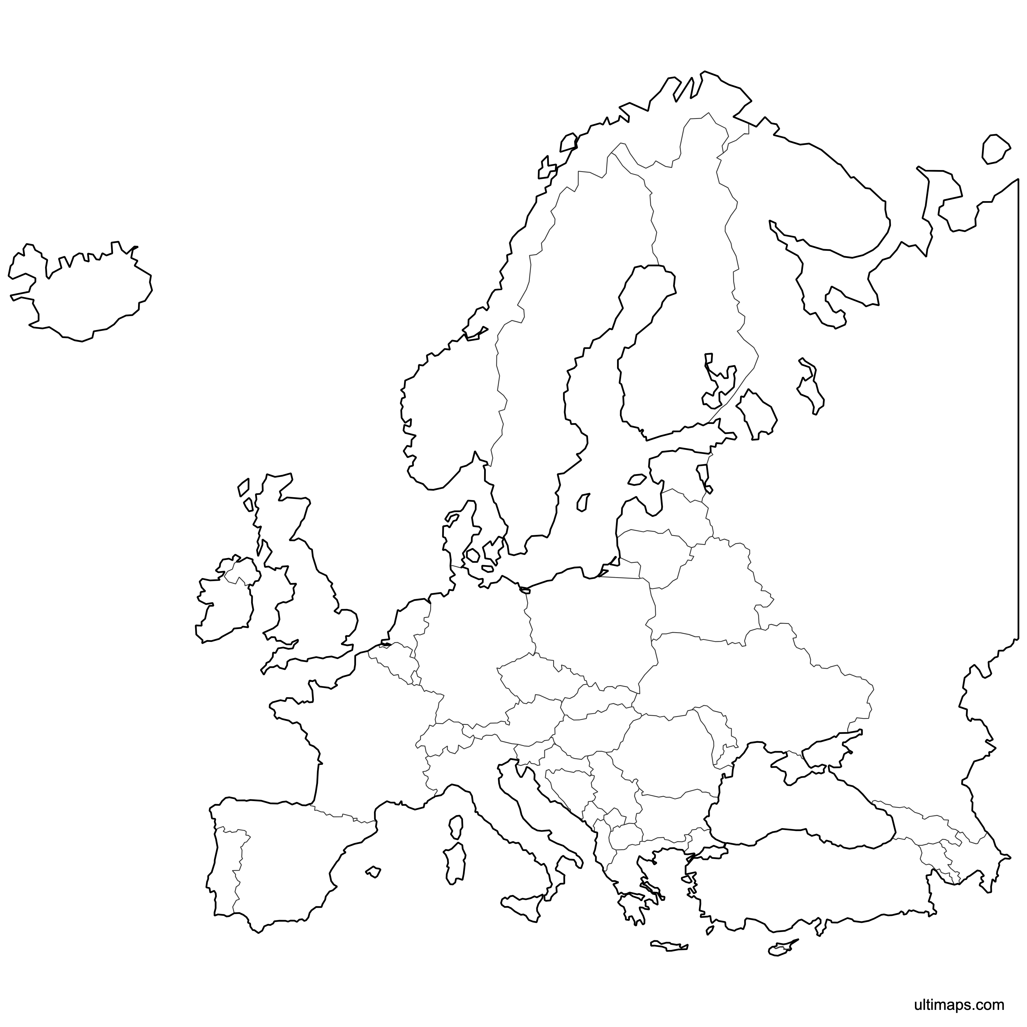 Below you can download free blank Map of Europe Countries in high resolution PNG or SVG formats suitable for printing or further editing. Most of the maps available in different color schemes and with different features (such as labels, roads or rivers). PNG maps are in 3600x3600px resolution and come with a transparent background.