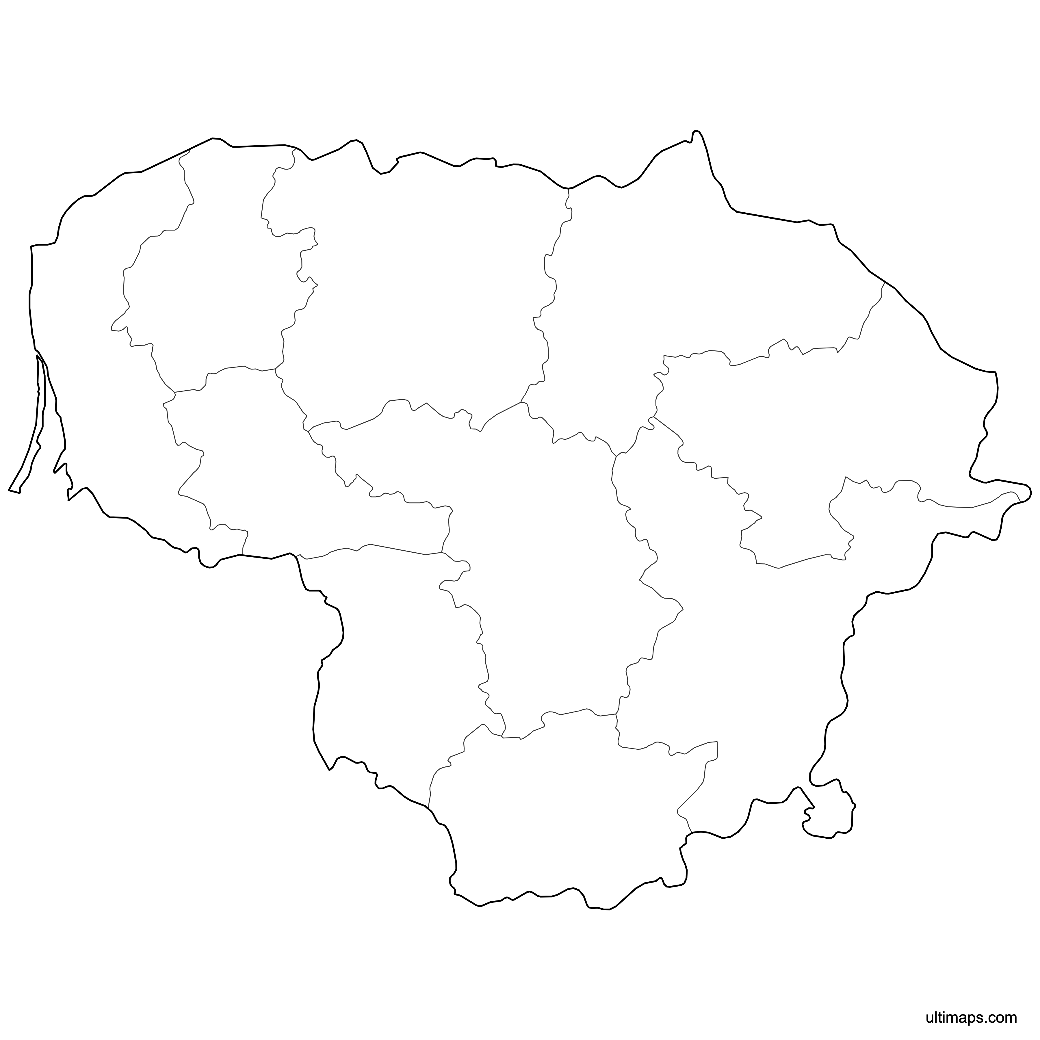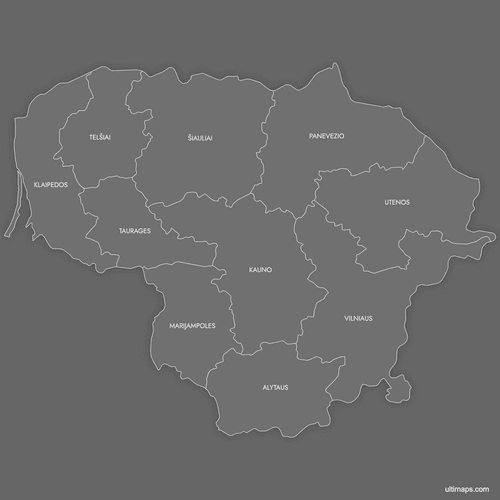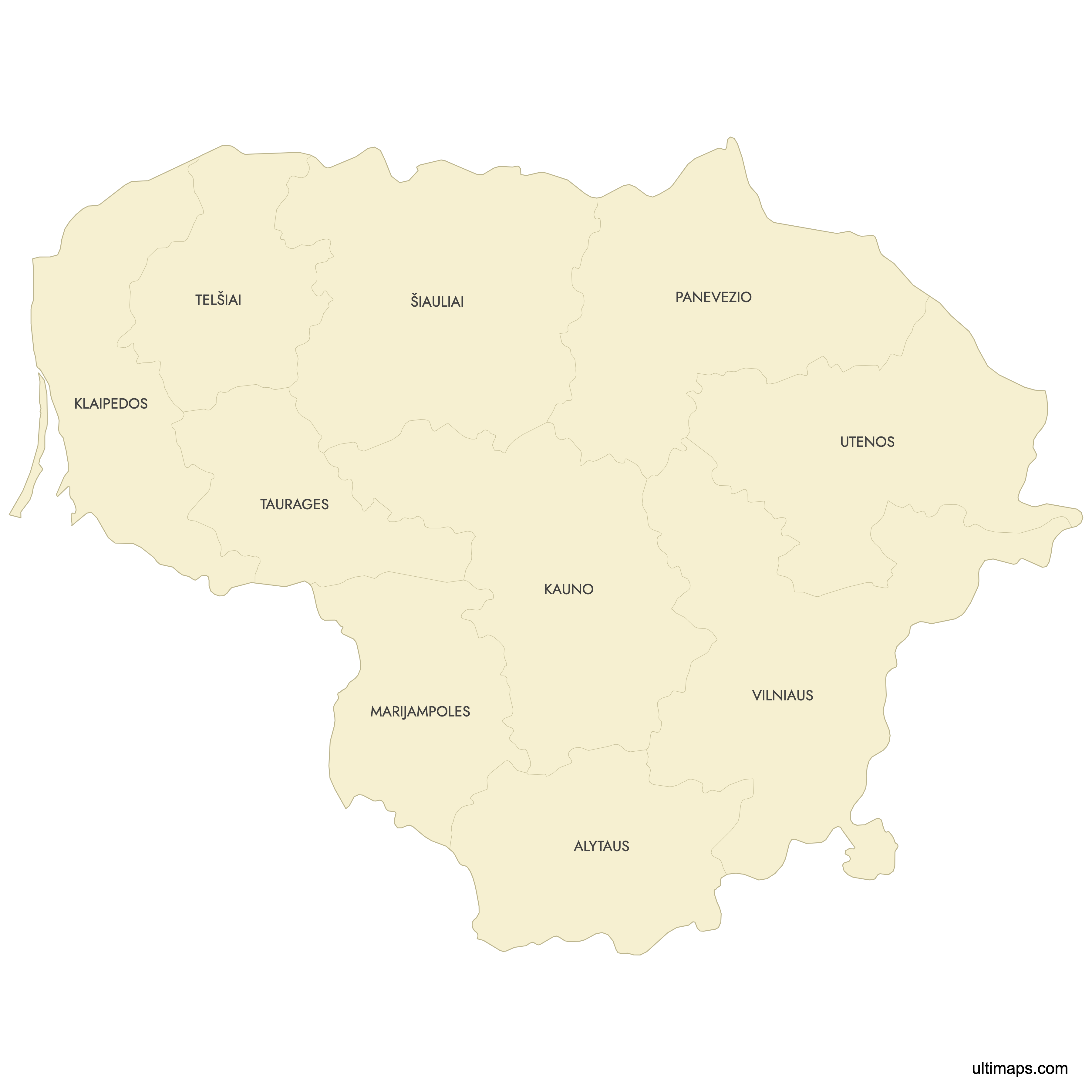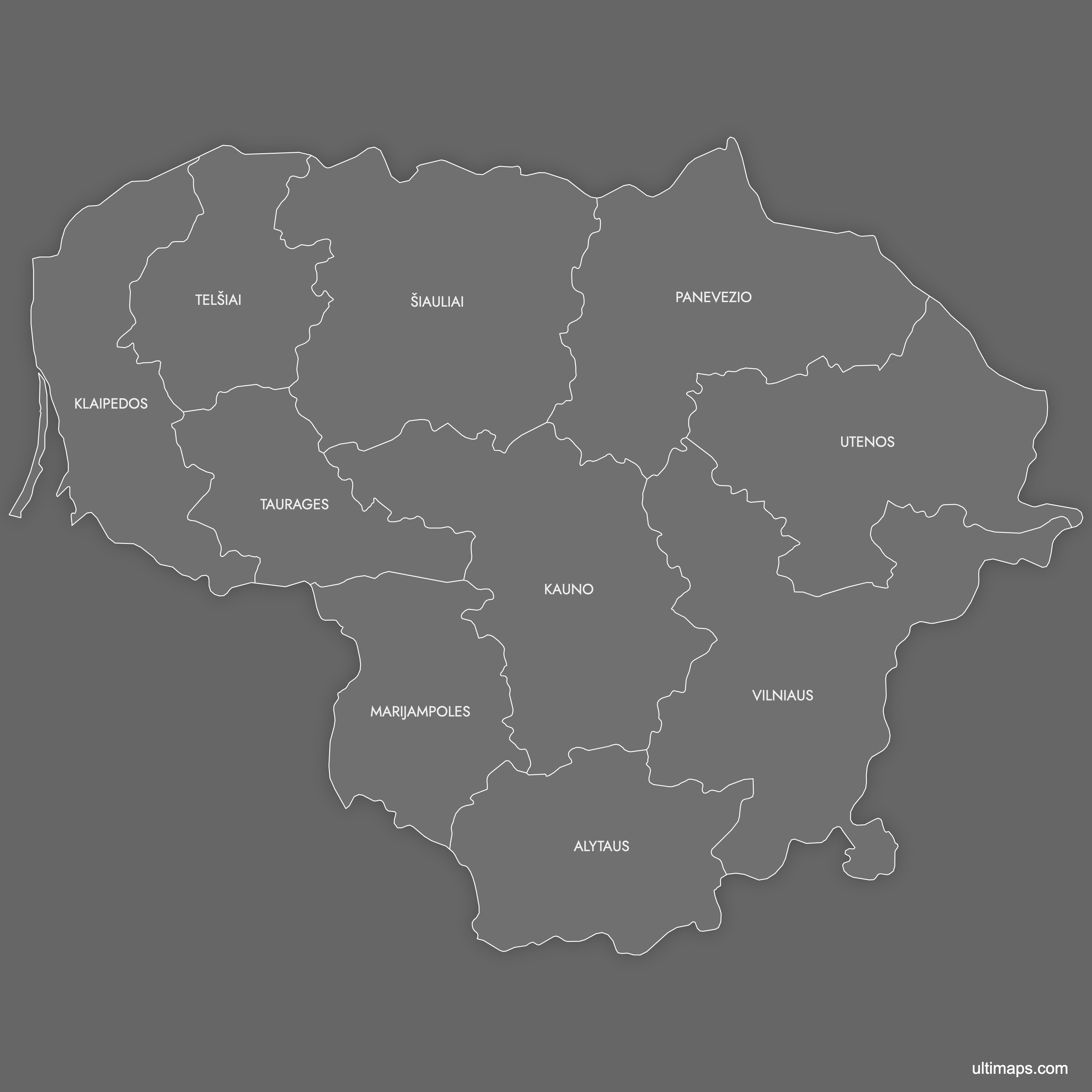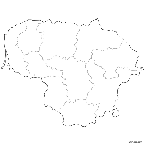 Below you can download free blank Map of Lithuania Counties in high resolution PNG or SVG formats suitable for printing or further editing. Most of the maps available in different color schemes and with different features (such as labels, roads or rivers). PNG maps are in 3600x3600px resolution and come with a transparent background.