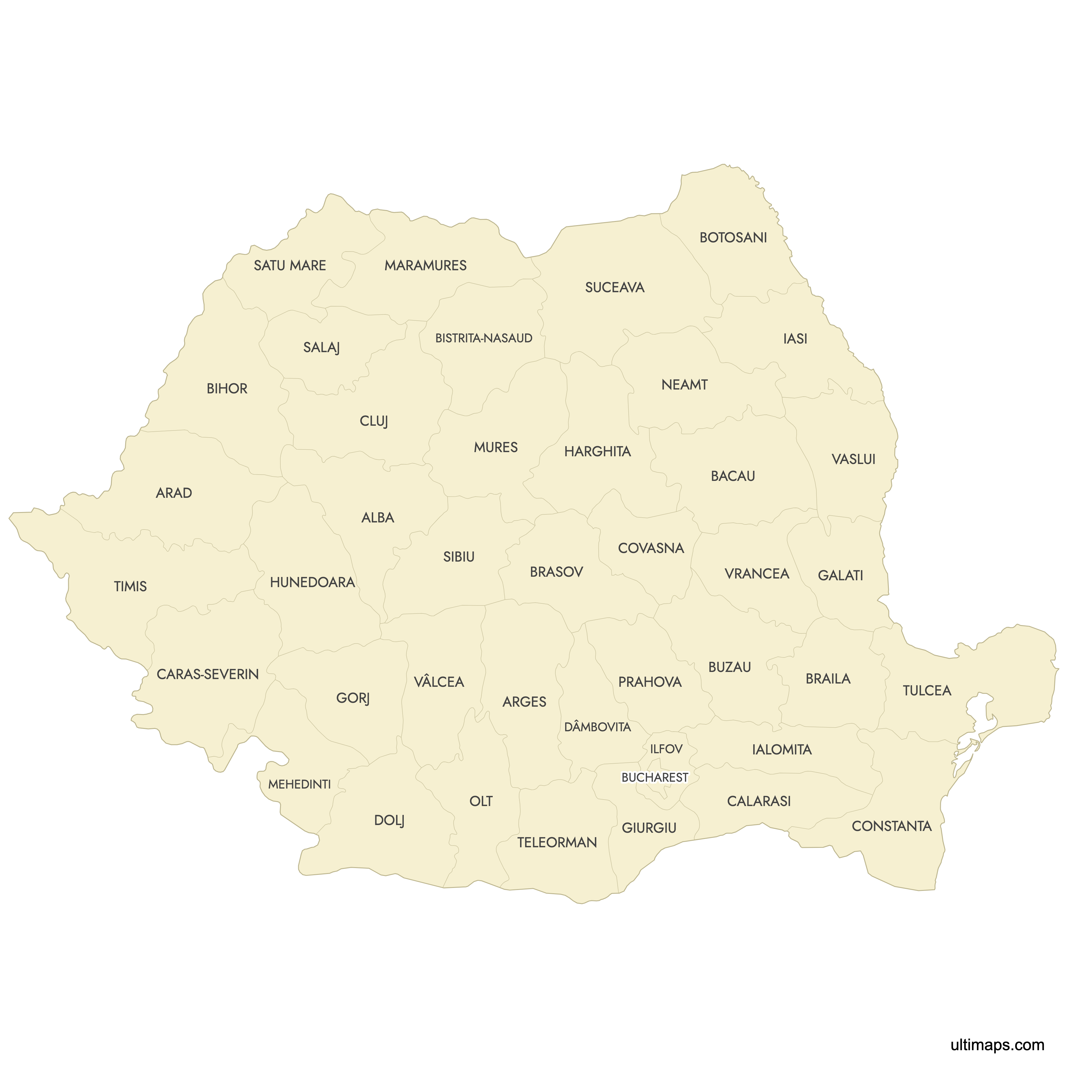 Below you can download free blank Map of Romania Counties in high resolution PNG or SVG formats suitable for printing or further editing. Most of the maps available in different color schemes and with different features (such as labels, roads or rivers). PNG maps are in 3600x3600px resolution and come with a transparent background.