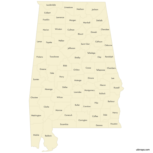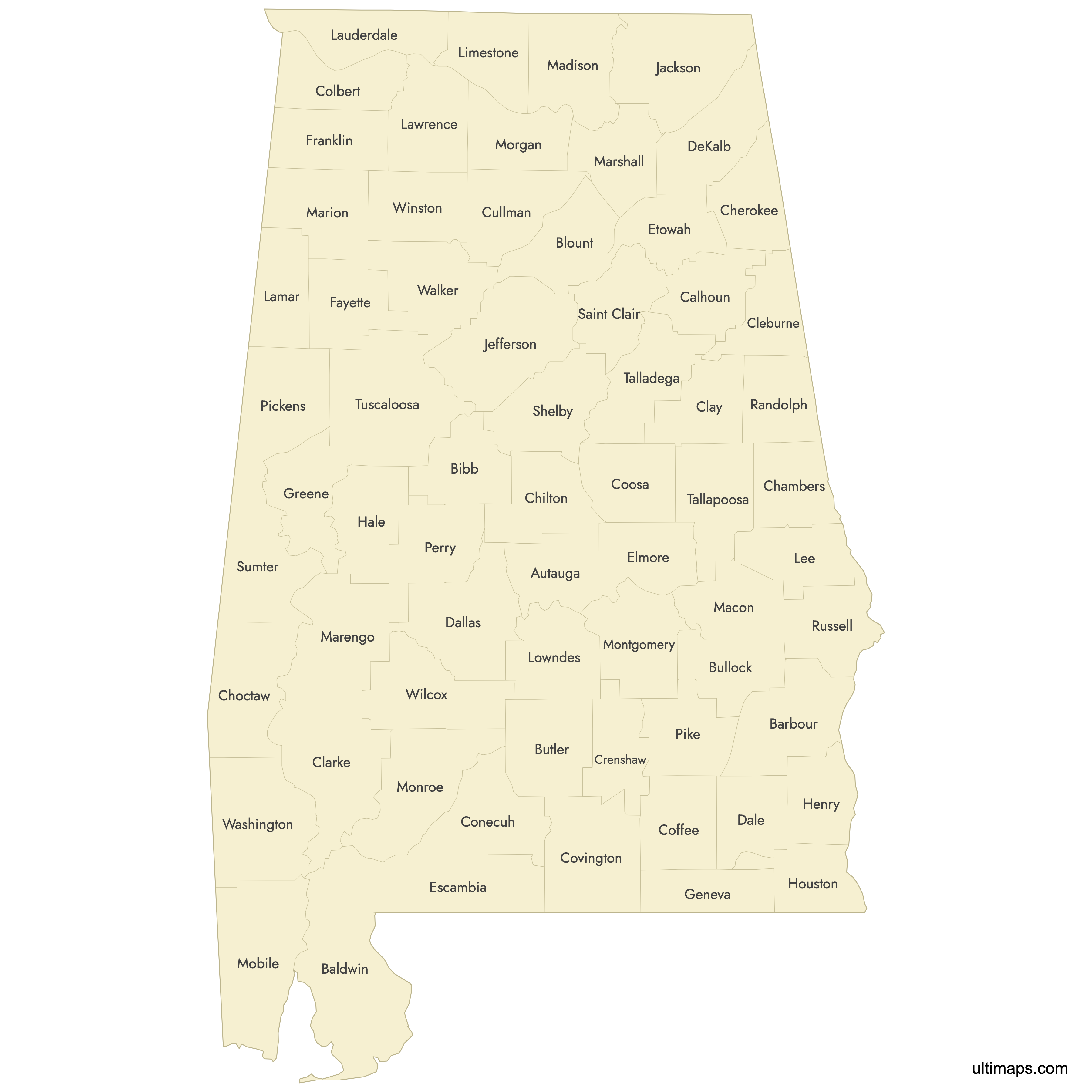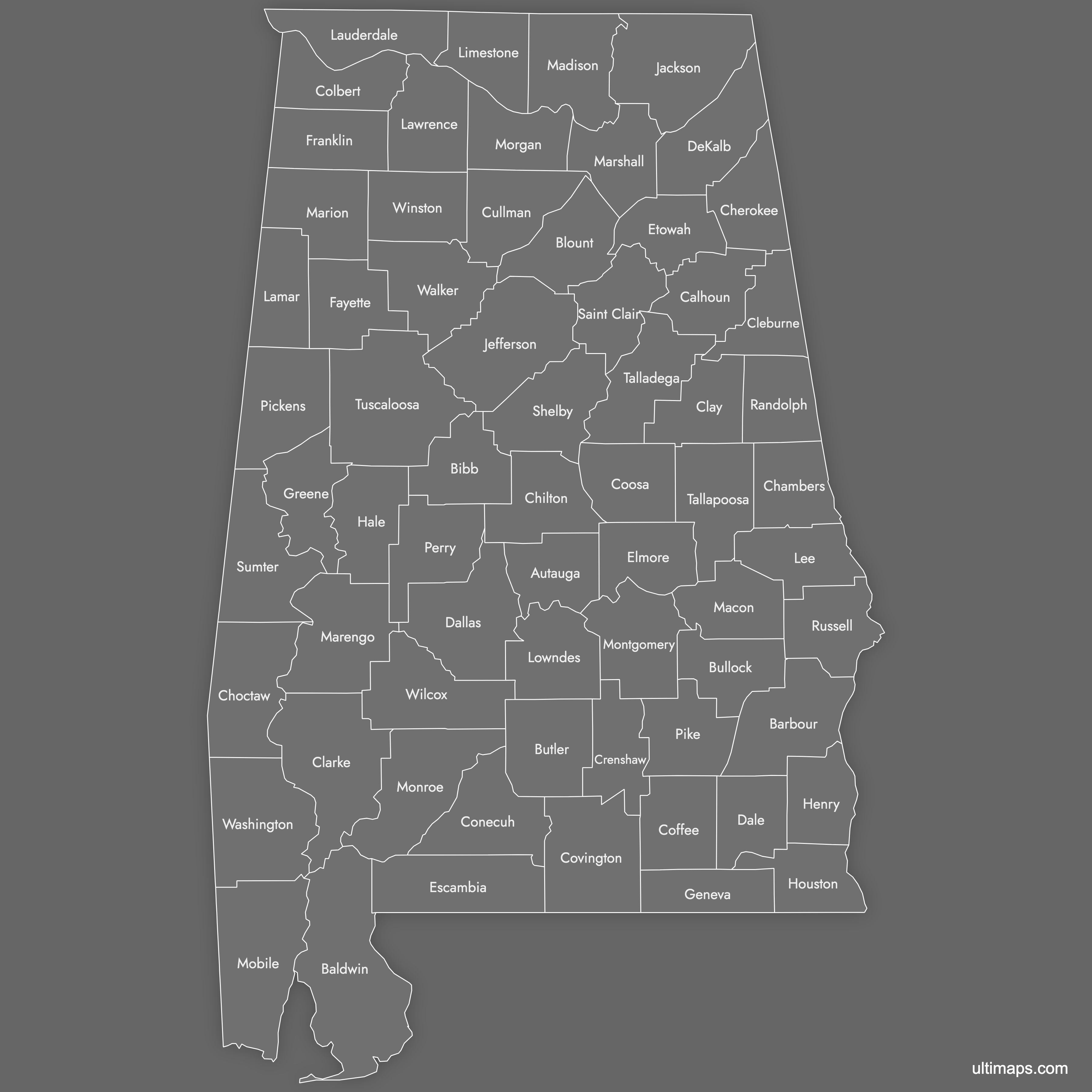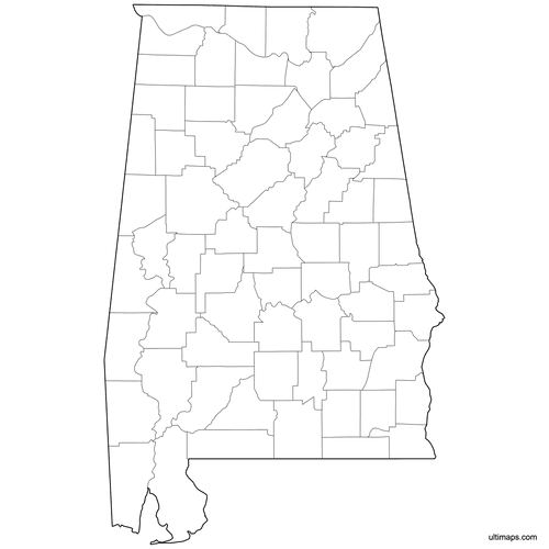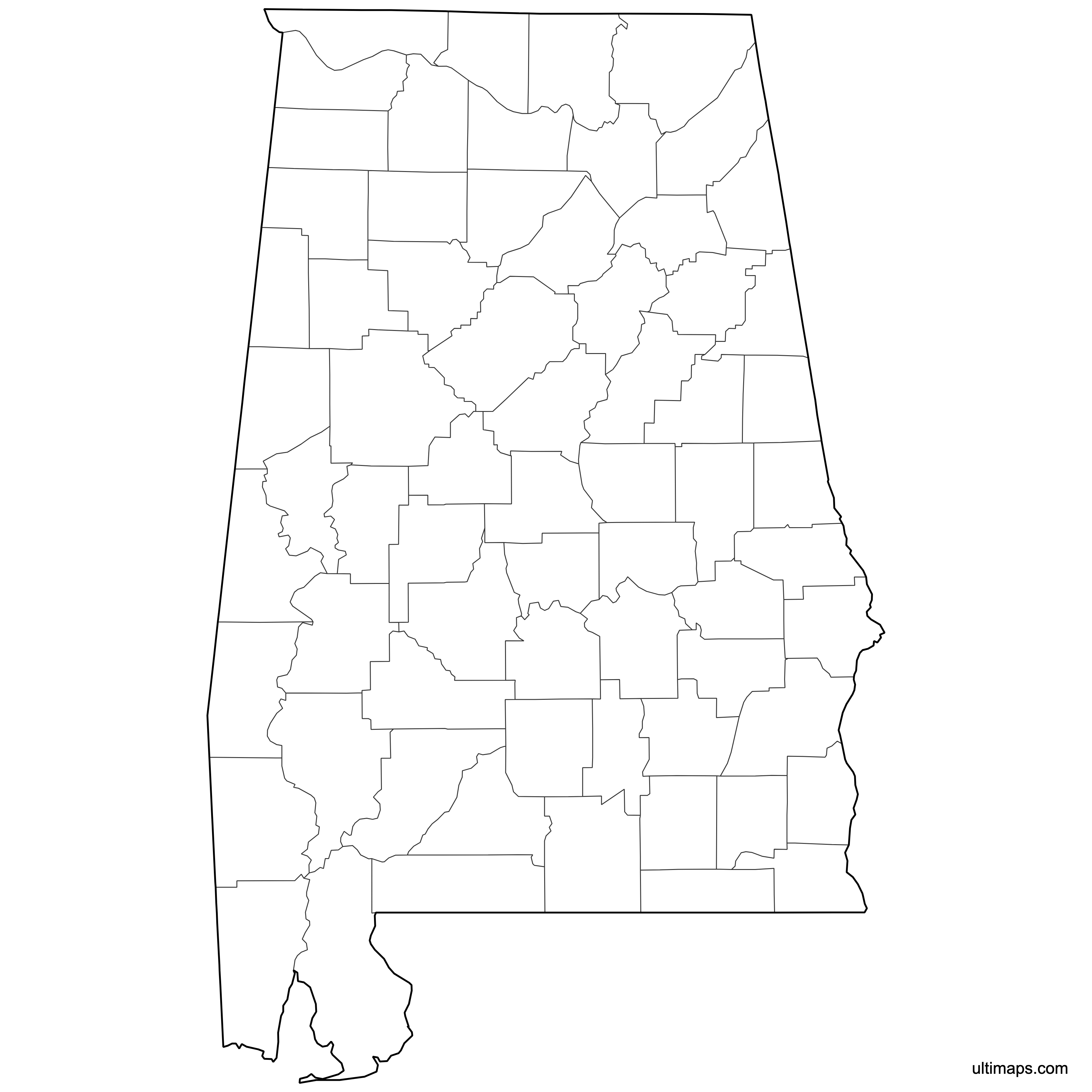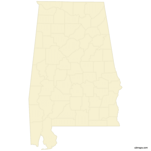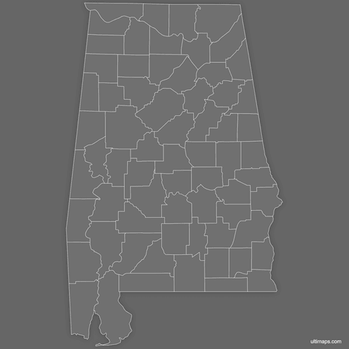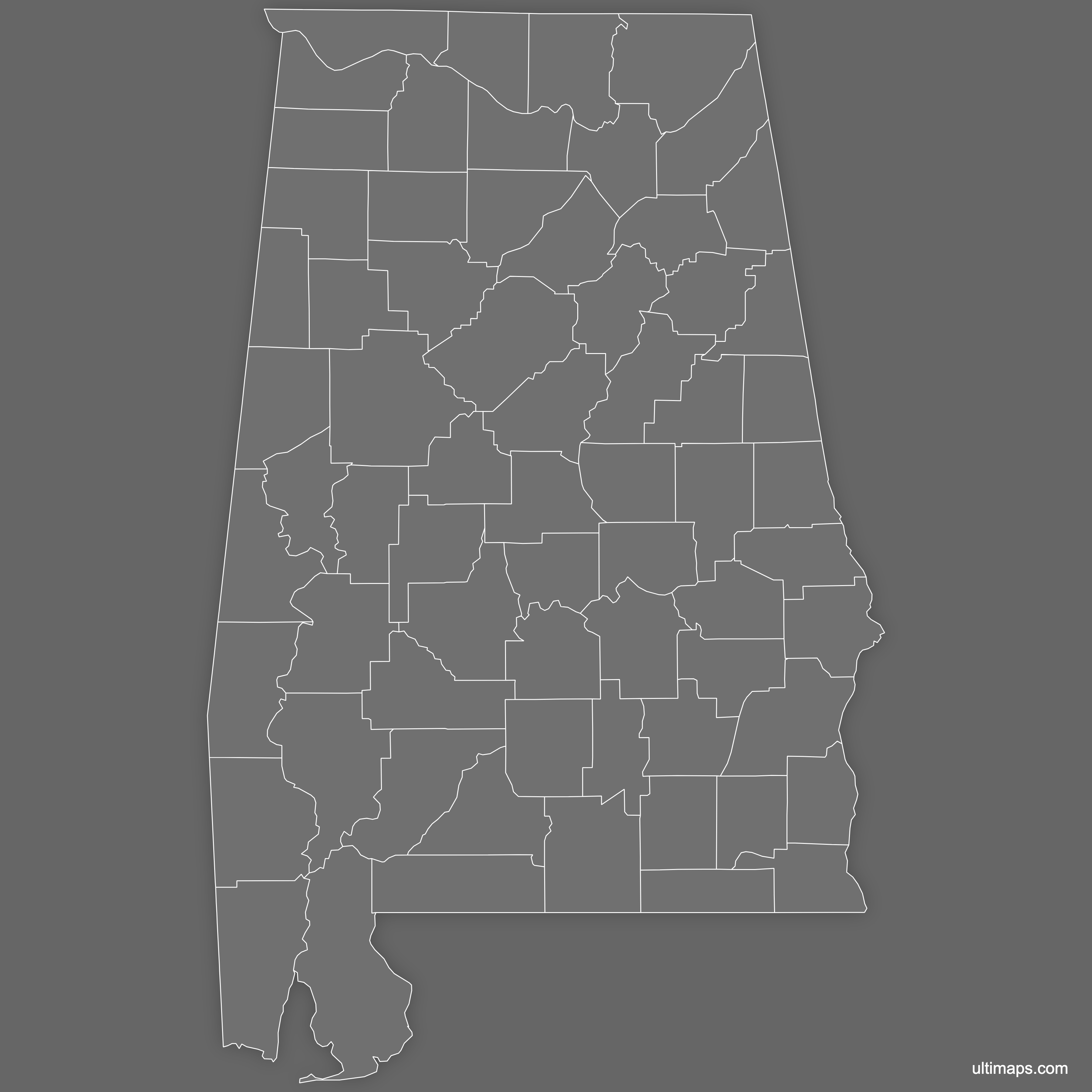 Below you can download free blank Map of Alabama Counties in high resolution PNG or SVG formats suitable for printing or further editing. Most of the maps available in different color schemes and with different features (such as labels, roads or rivers). PNG maps are in 3600x3600px resolution and come with a transparent background.