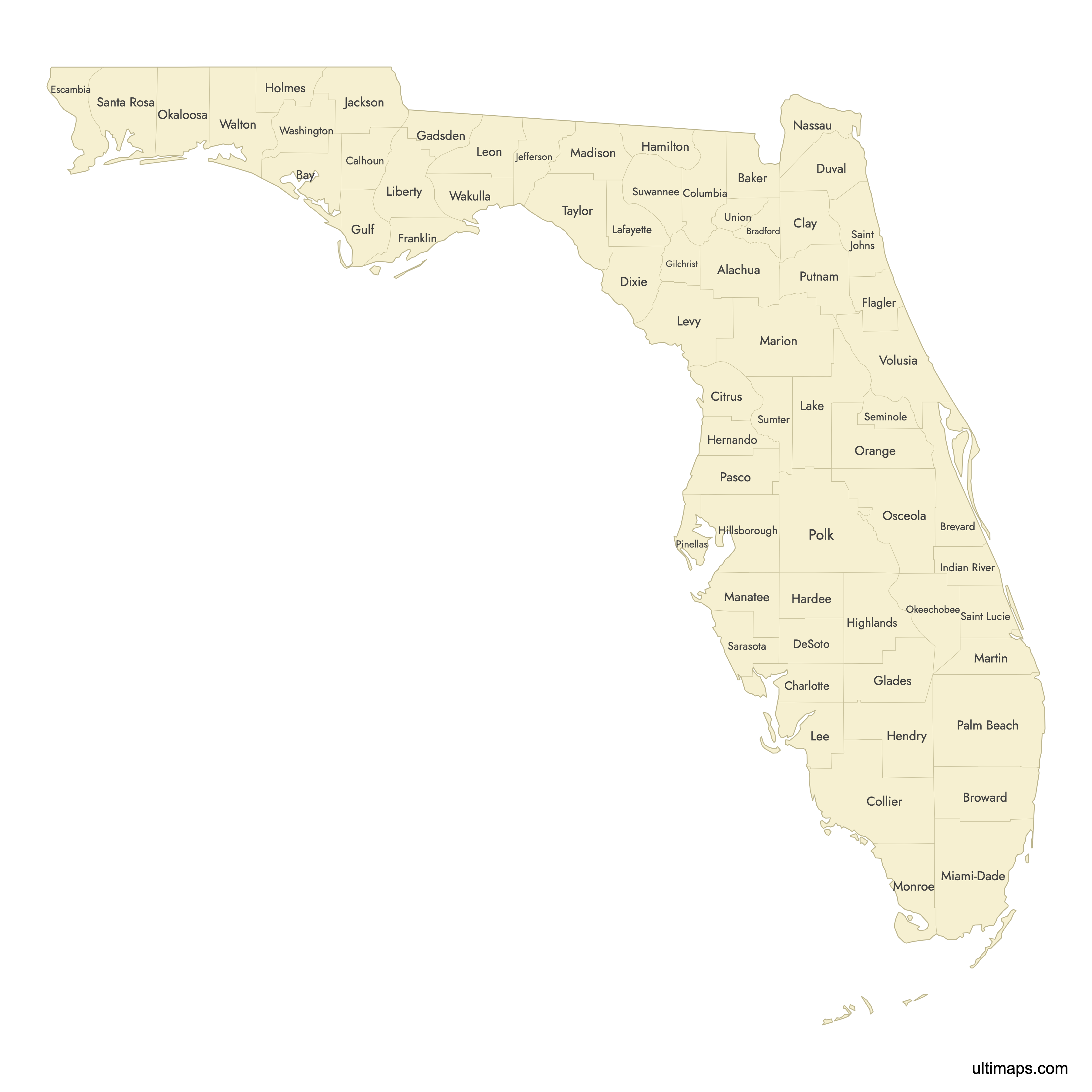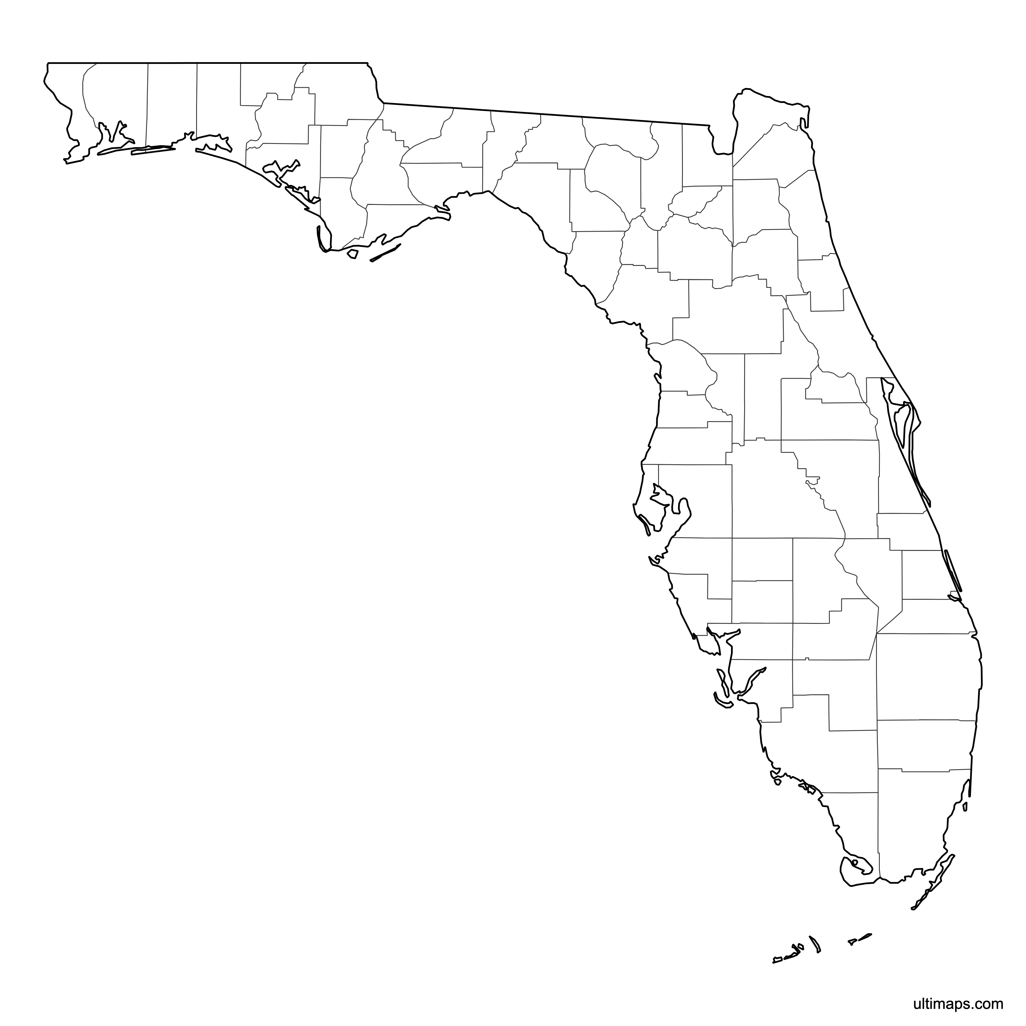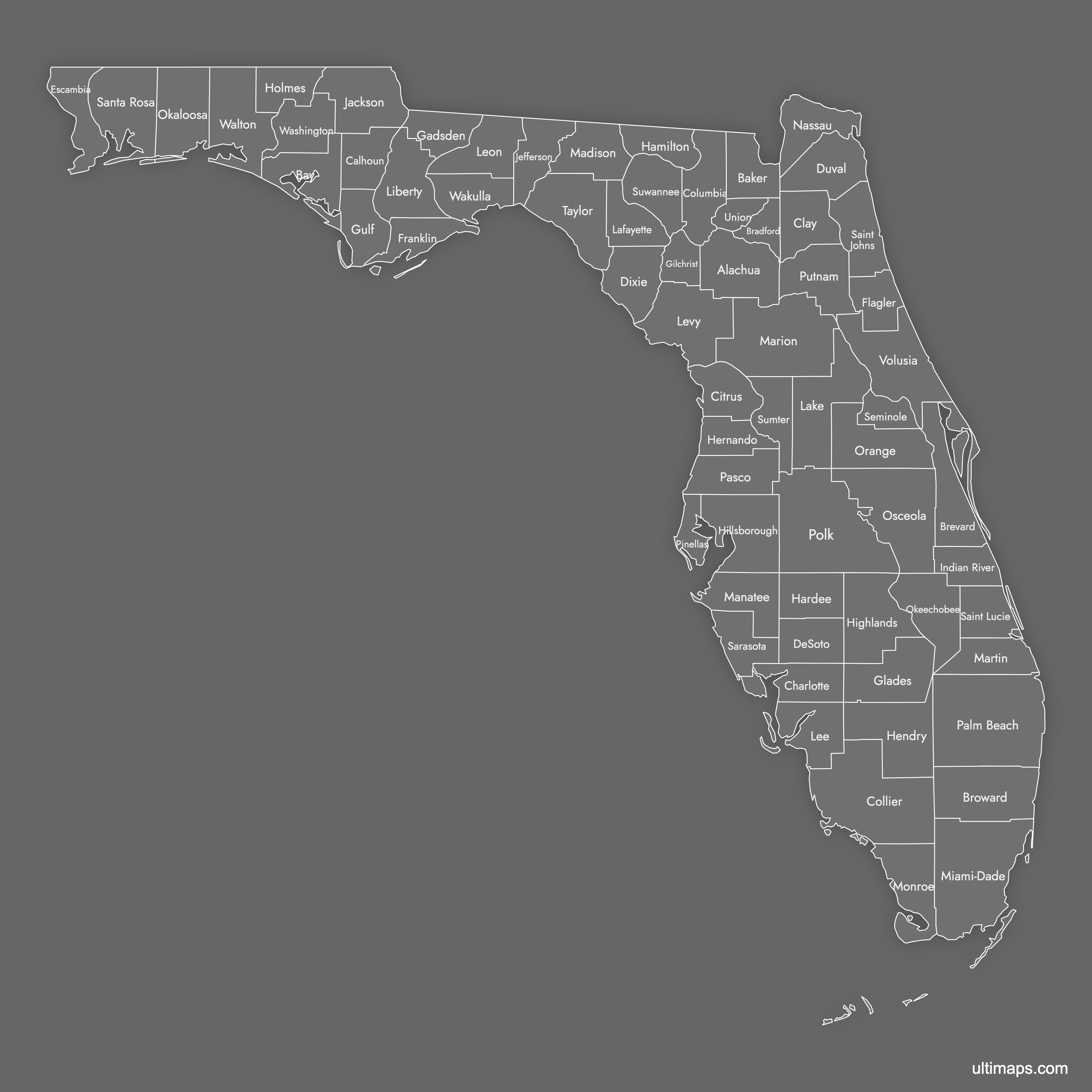 Below you can download free blank Map of Florida Counties in high resolution PNG or SVG formats suitable for printing or further editing. Most of the maps available in different color schemes and with different features (such as labels, roads or rivers). PNG maps are in 3600x3600px resolution and come with a transparent background.