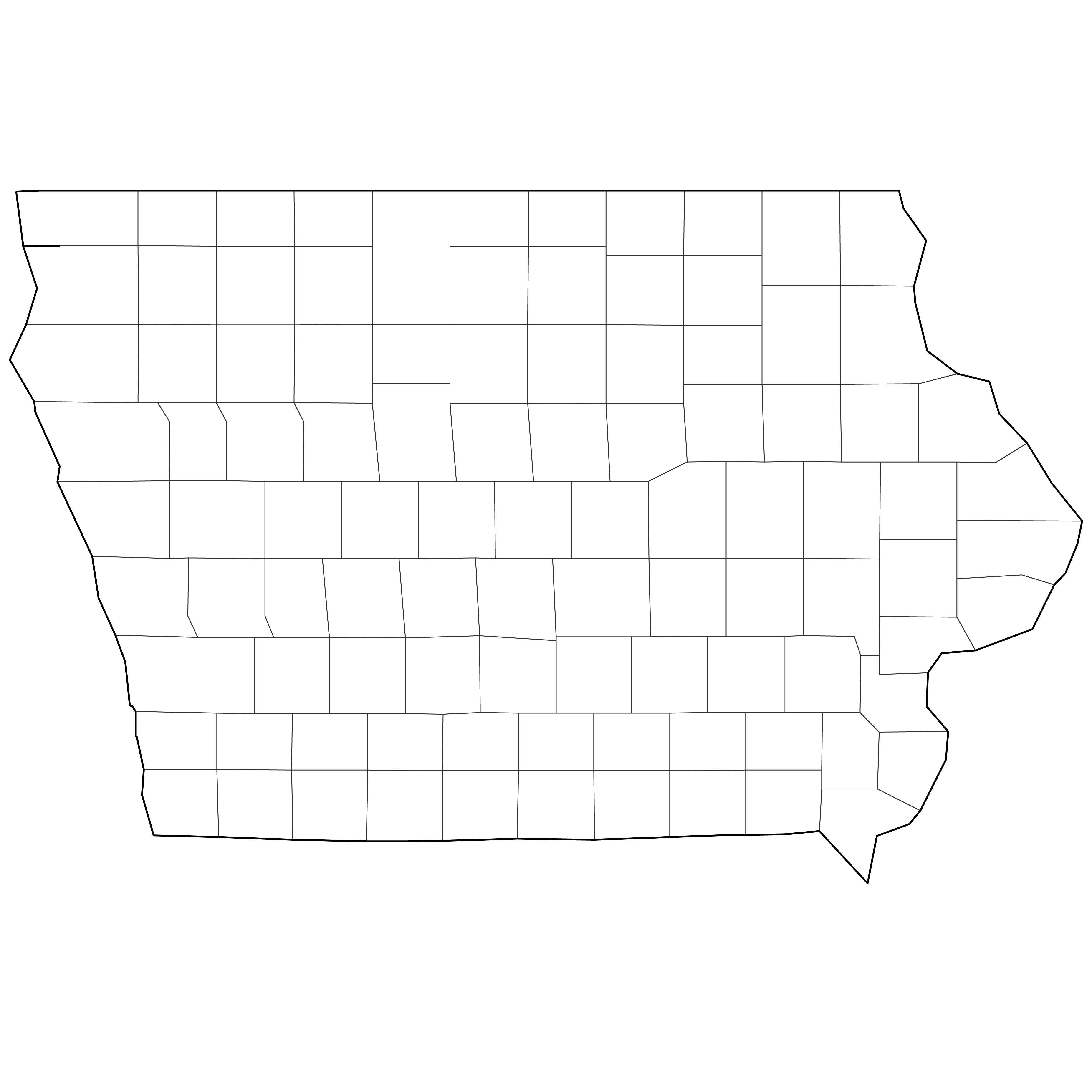 Below you can download free blank Map of Iowa Counties in high resolution PNG or SVG formats suitable for printing or further editing. Most of the maps available in different color schemes and with different features (such as labels, roads or rivers). PNG maps are in 3600x3600px resolution and come with a transparent background.