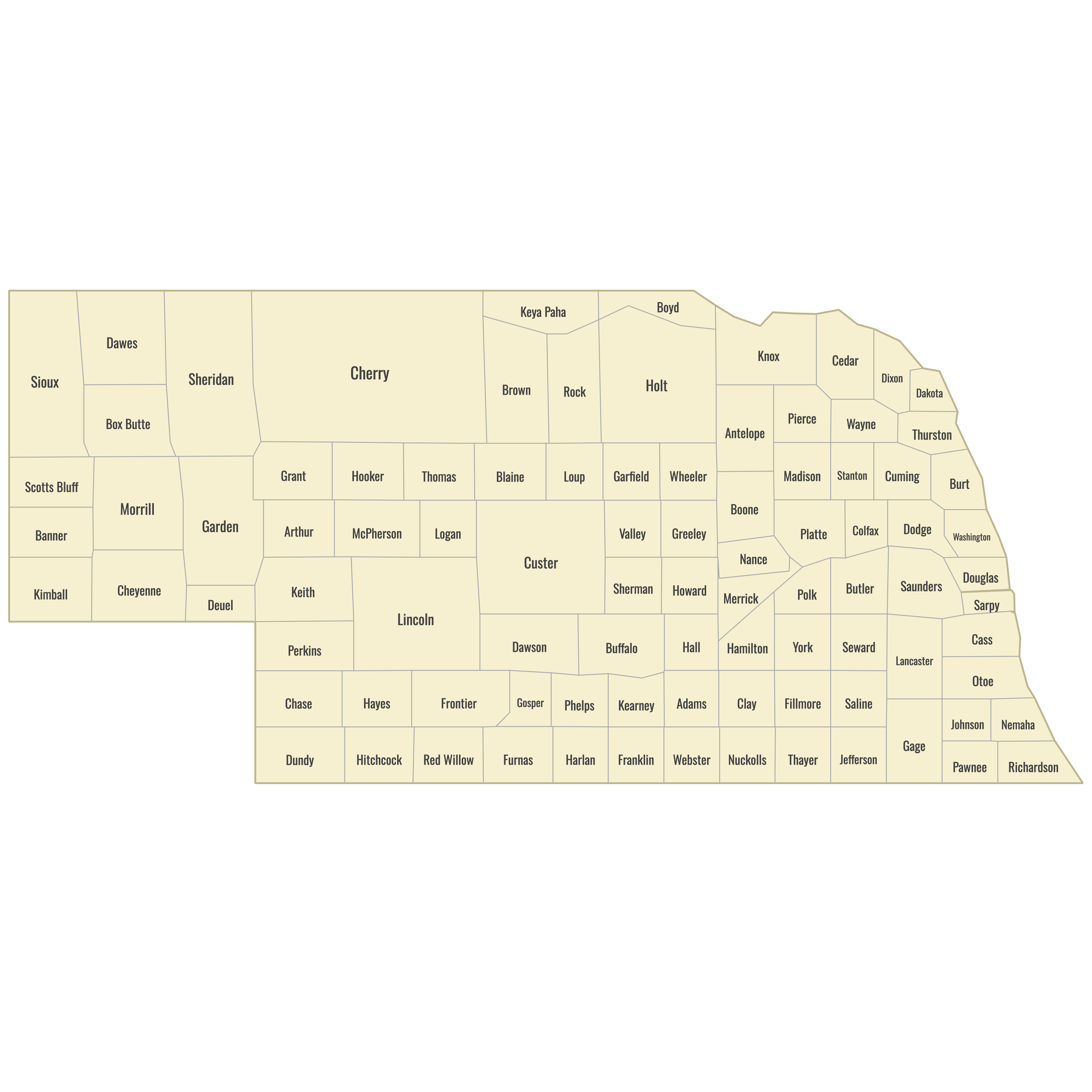Below you can download free blank Map of Nebraska Counties in high resolution PNG or SVG formats suitable for printing or further editing. Most of the maps available in different color schemes and with different features (such as labels, roads or rivers). PNG maps are in 3600x3600px resolution and come with a transparent background.
