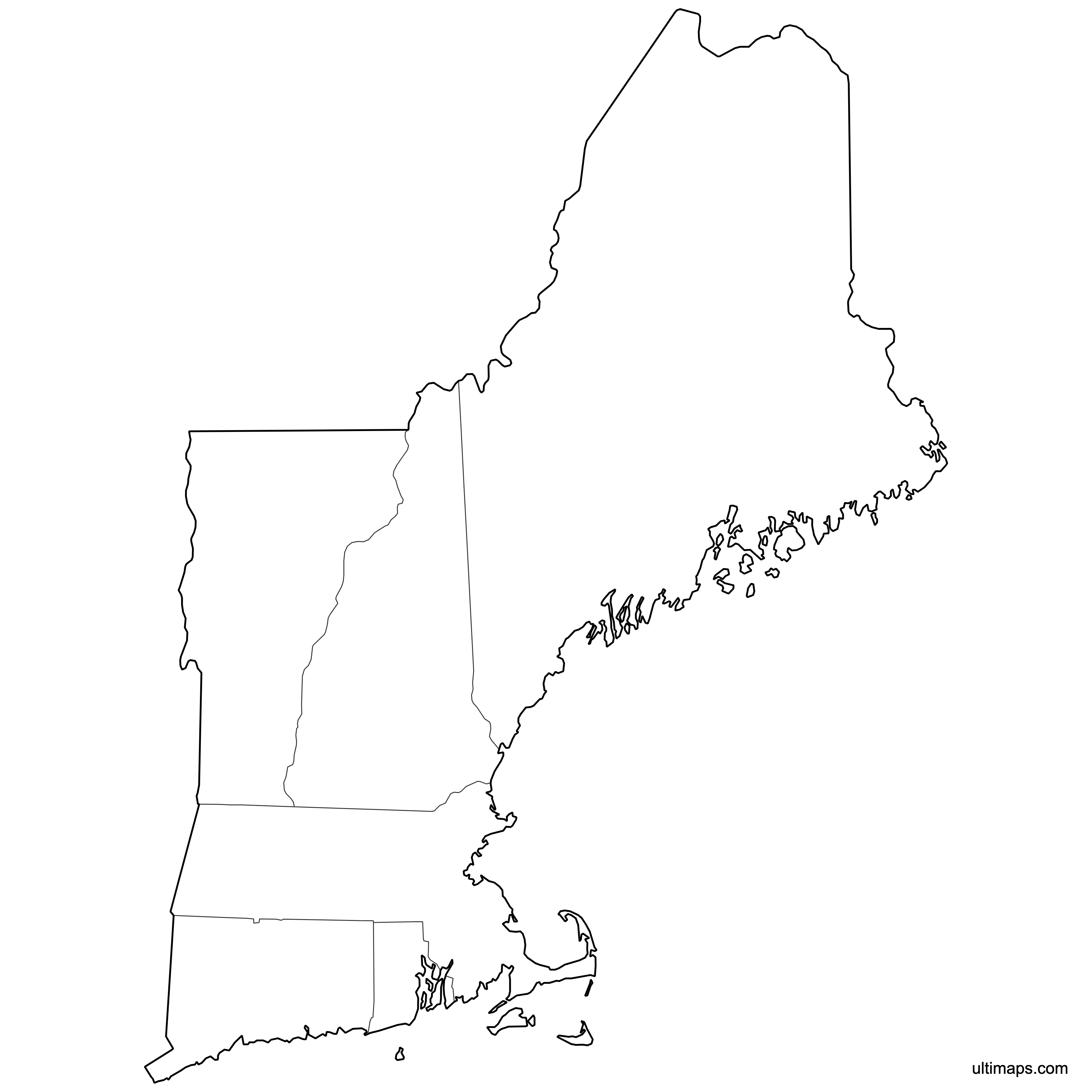 Below you can download free blank Map of New England States in high resolution PNG or SVG formats suitable for printing or further editing. Most of the maps available in different color schemes and with different features (such as labels, roads or rivers). PNG maps are in 3600x3600px resolution and come with a transparent background.