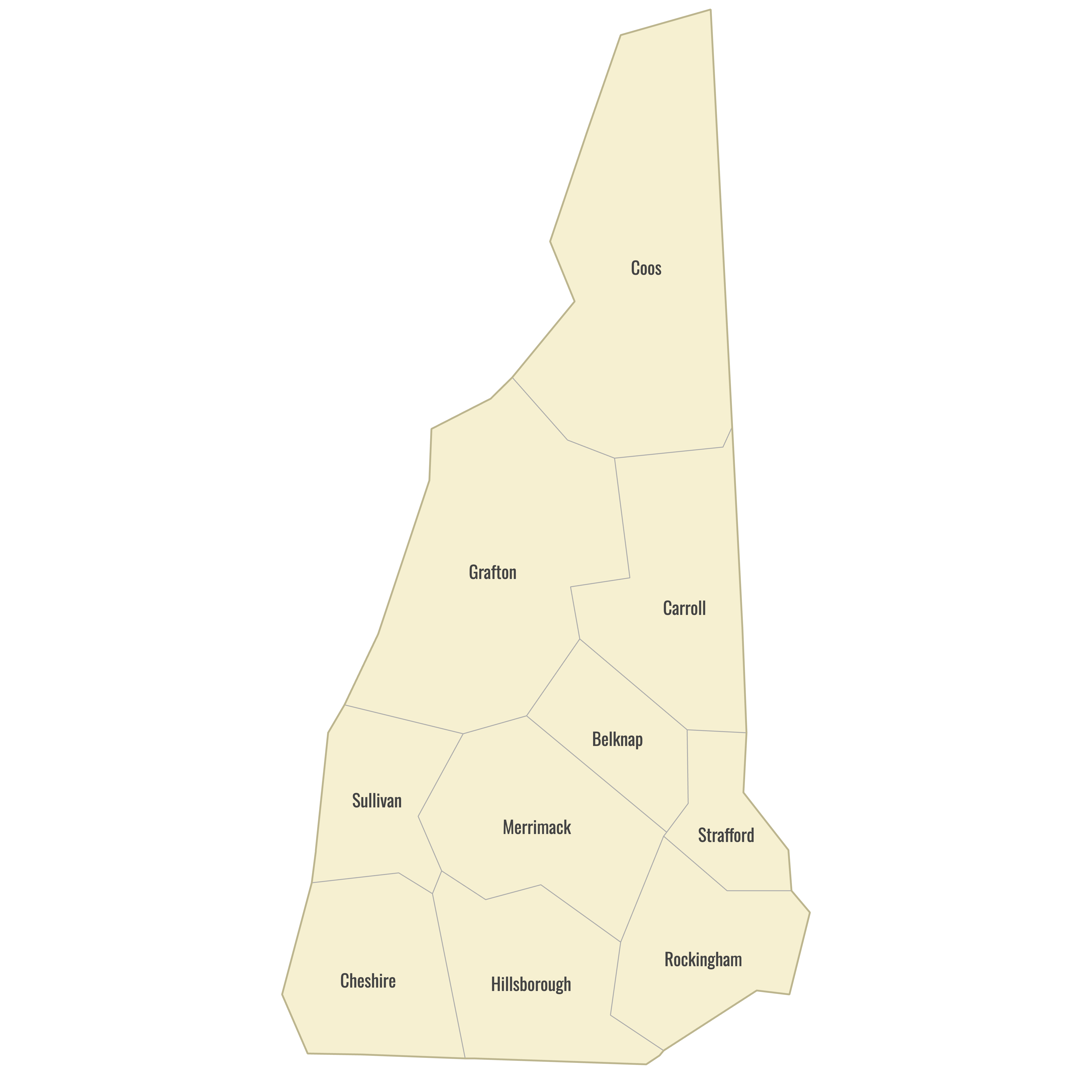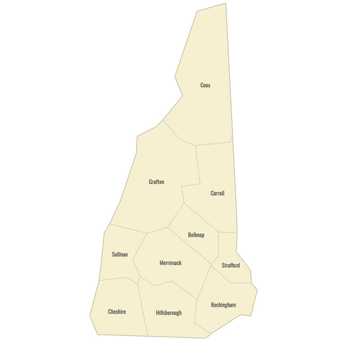 Below you can download free blank Map of New Hampshire Counties in high resolution PNG or SVG formats suitable for printing or further editing. Most of the maps available in different color schemes and with different features (such as labels, roads or rivers). PNG maps are in 3600x3600px resolution and come with a transparent background.