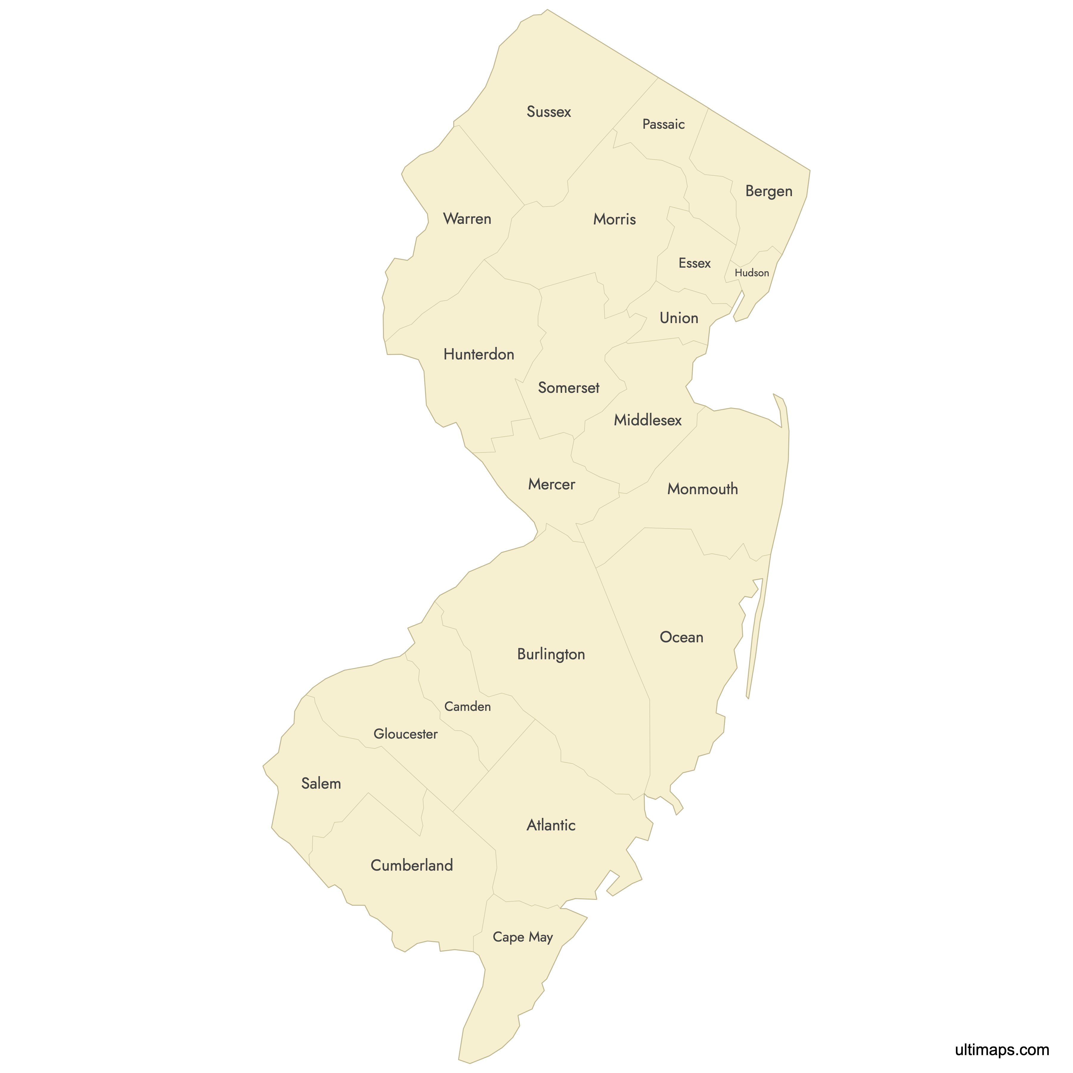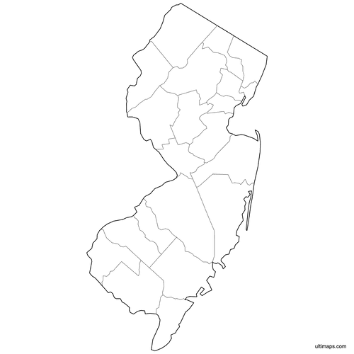 Below you can download free blank Map of New Jersey Counties in high resolution PNG or SVG formats suitable for printing or further editing. Most of the maps available in different color schemes and with different features (such as labels, roads or rivers). PNG maps are in 3600x3600px resolution and come with a transparent background.