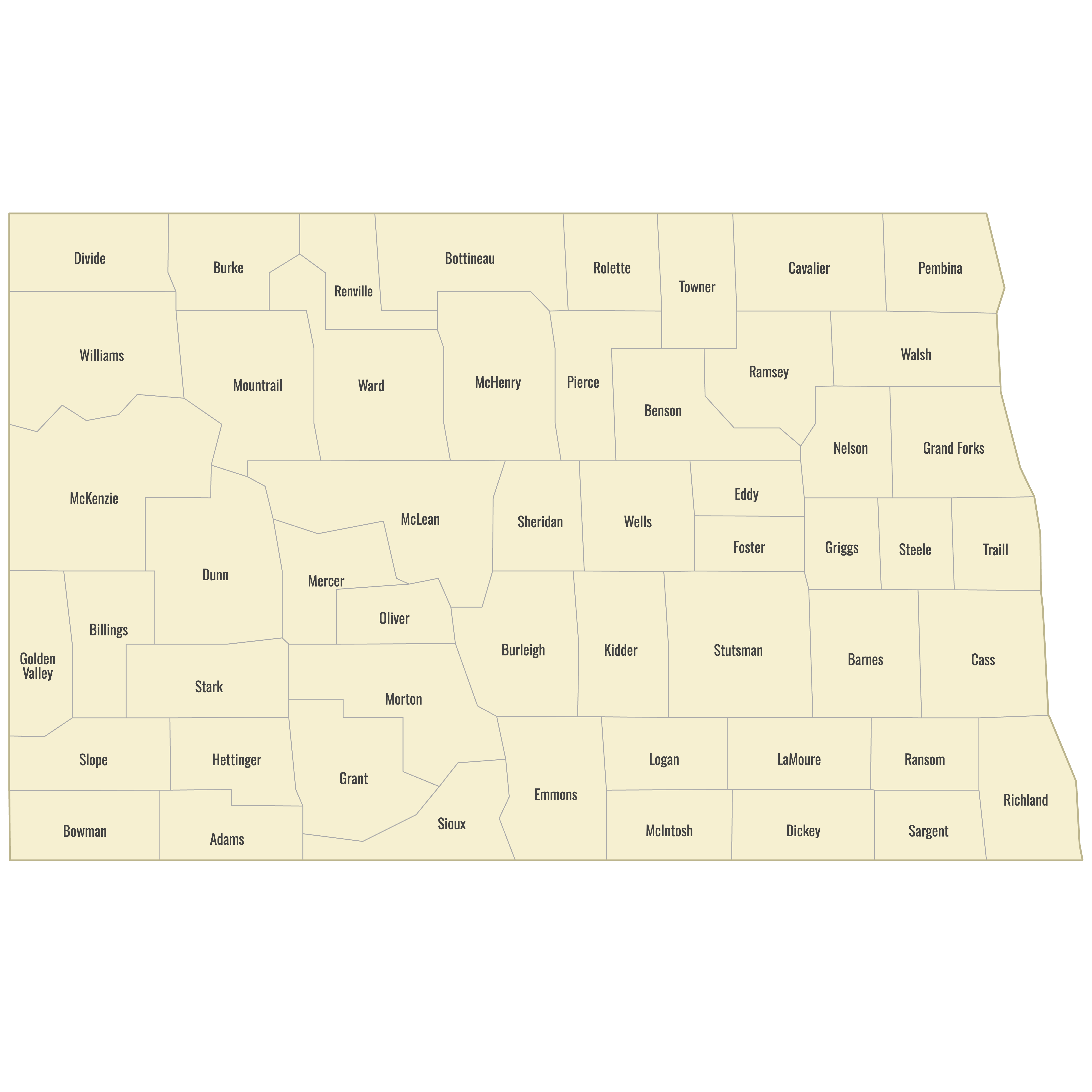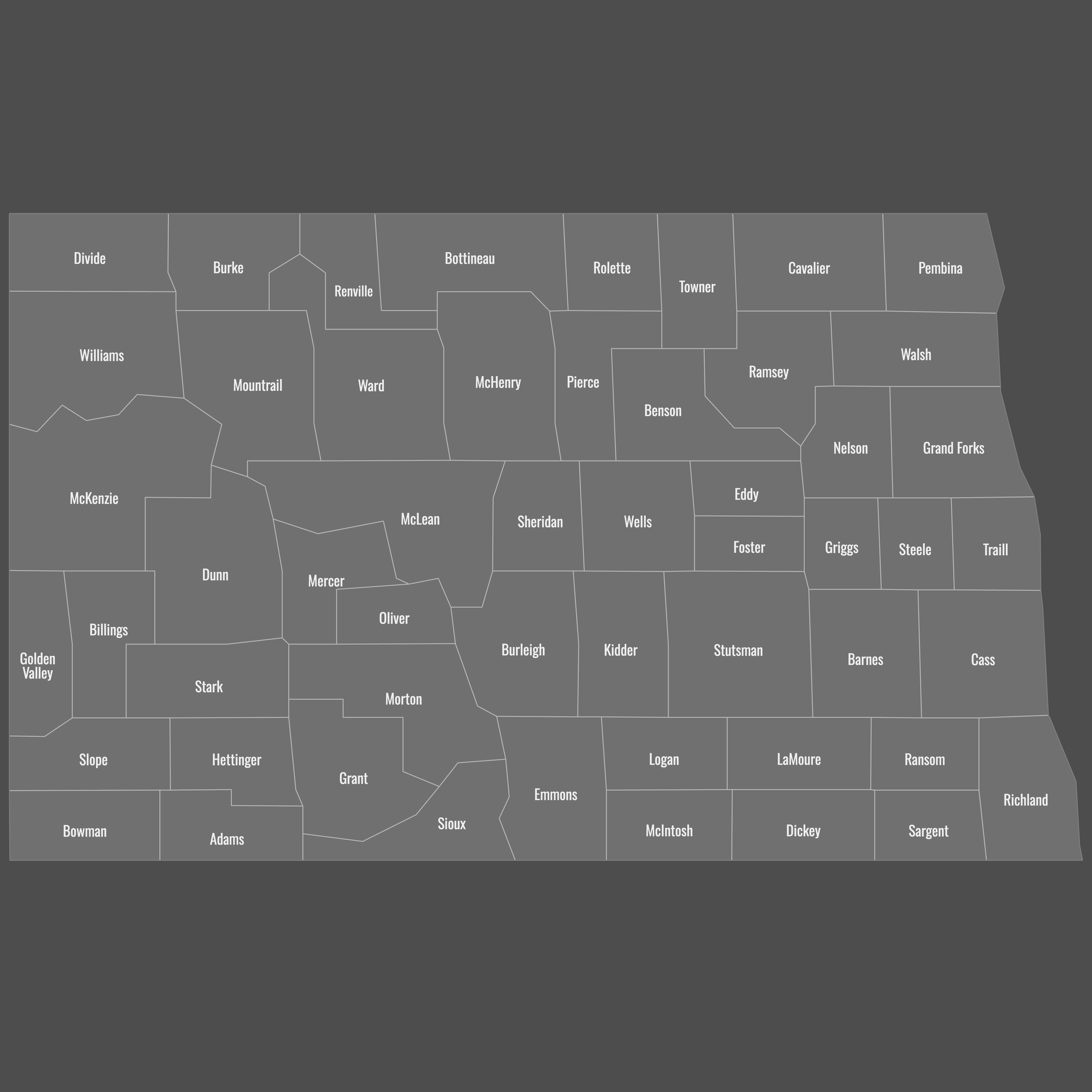 Below you can download free blank Map of North Dakota Counties in high resolution PNG or SVG formats suitable for printing or further editing. Most of the maps available in different color schemes and with different features (such as labels, roads or rivers). PNG maps are in 3600x3600px resolution and come with a transparent background.