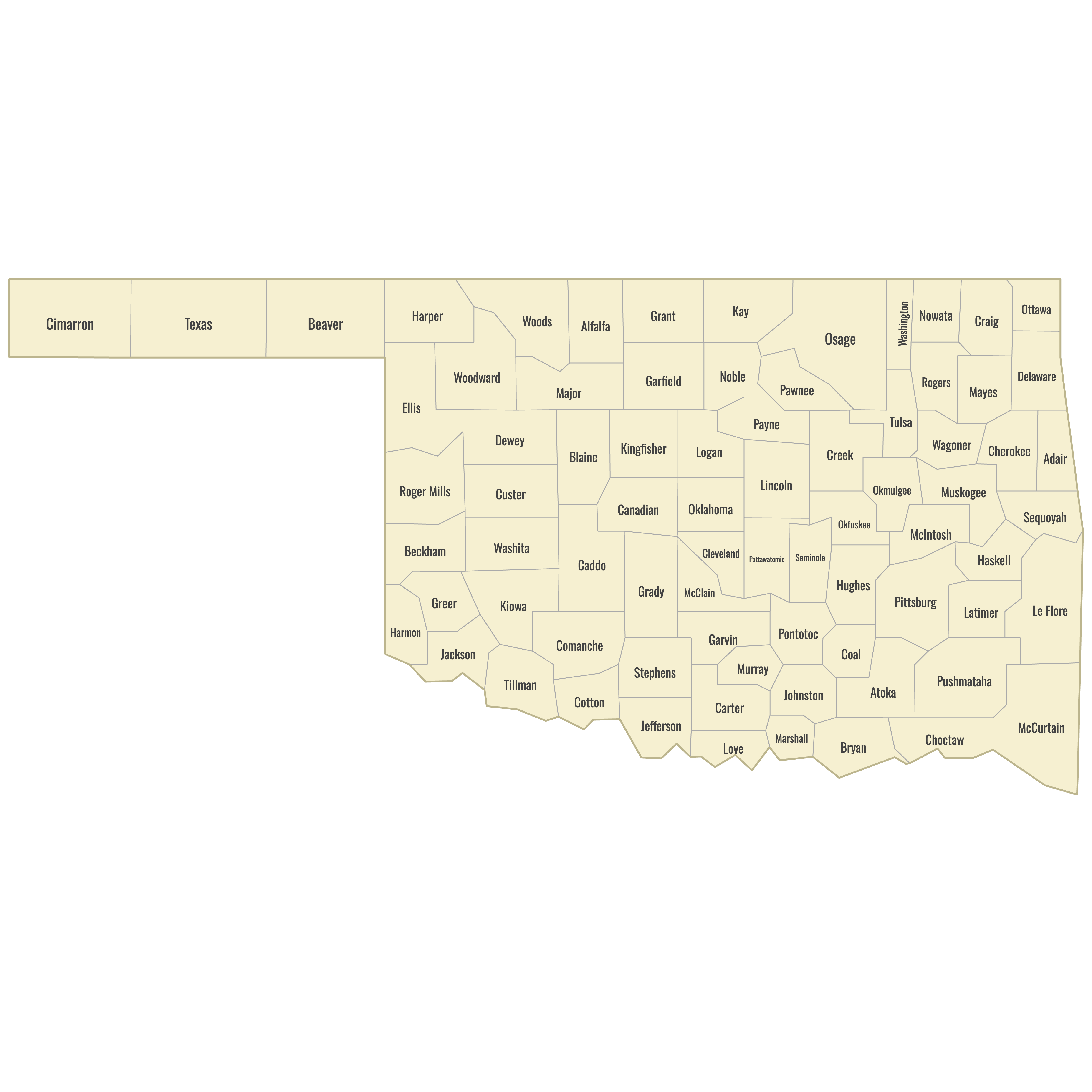 Below you can download free blank Map of Oklahoma Counties in high resolution PNG or SVG formats suitable for printing or further editing. Most of the maps available in different color schemes and with different features (such as labels, roads or rivers). PNG maps are in 3600x3600px resolution and come with a transparent background.