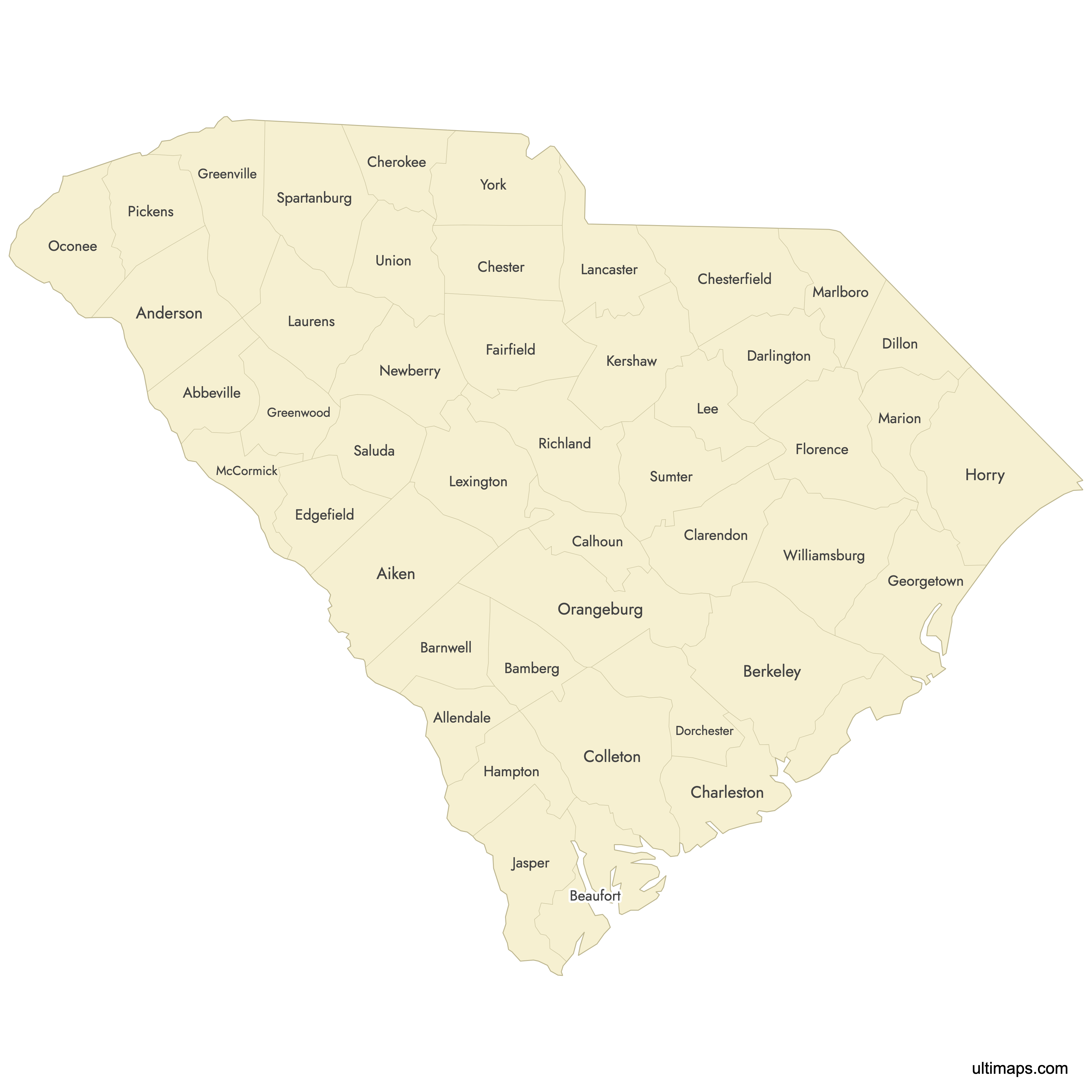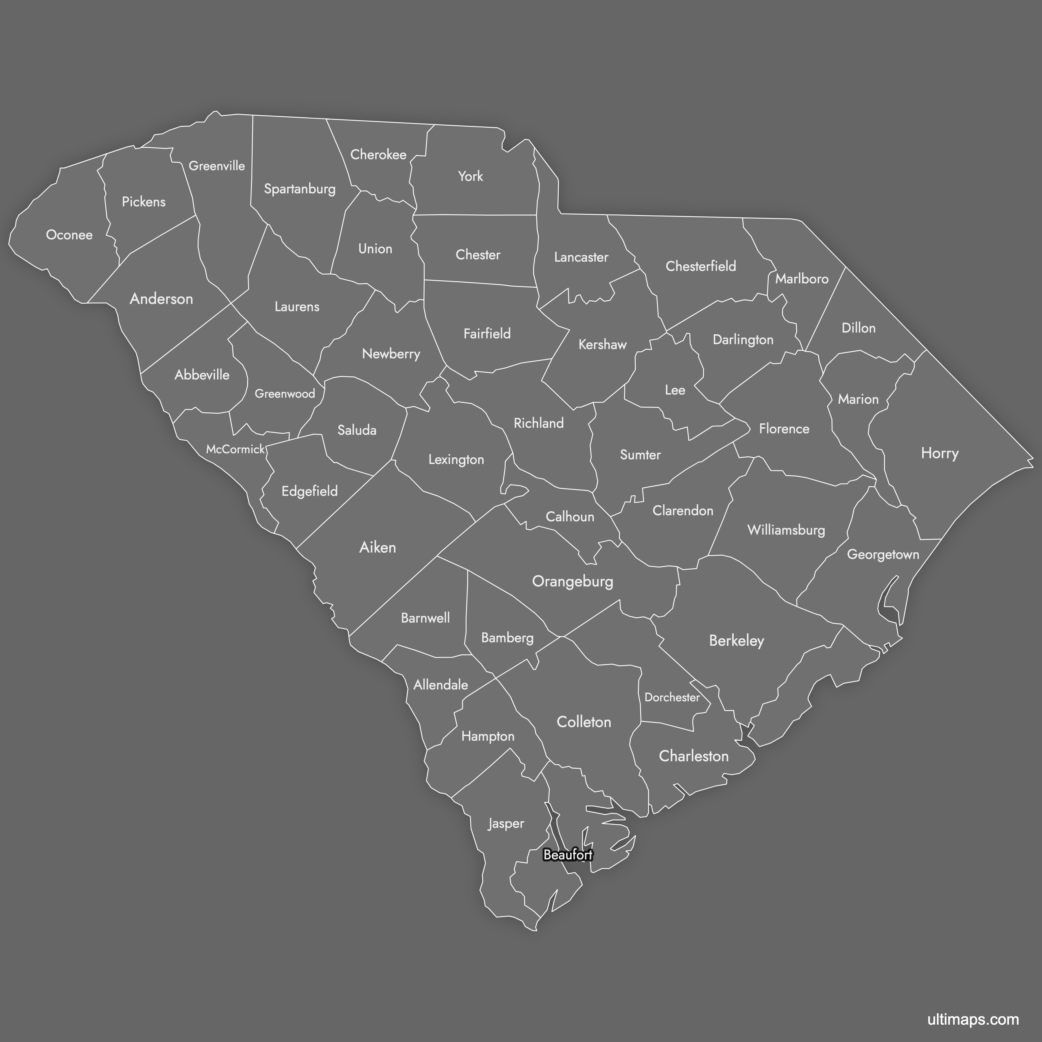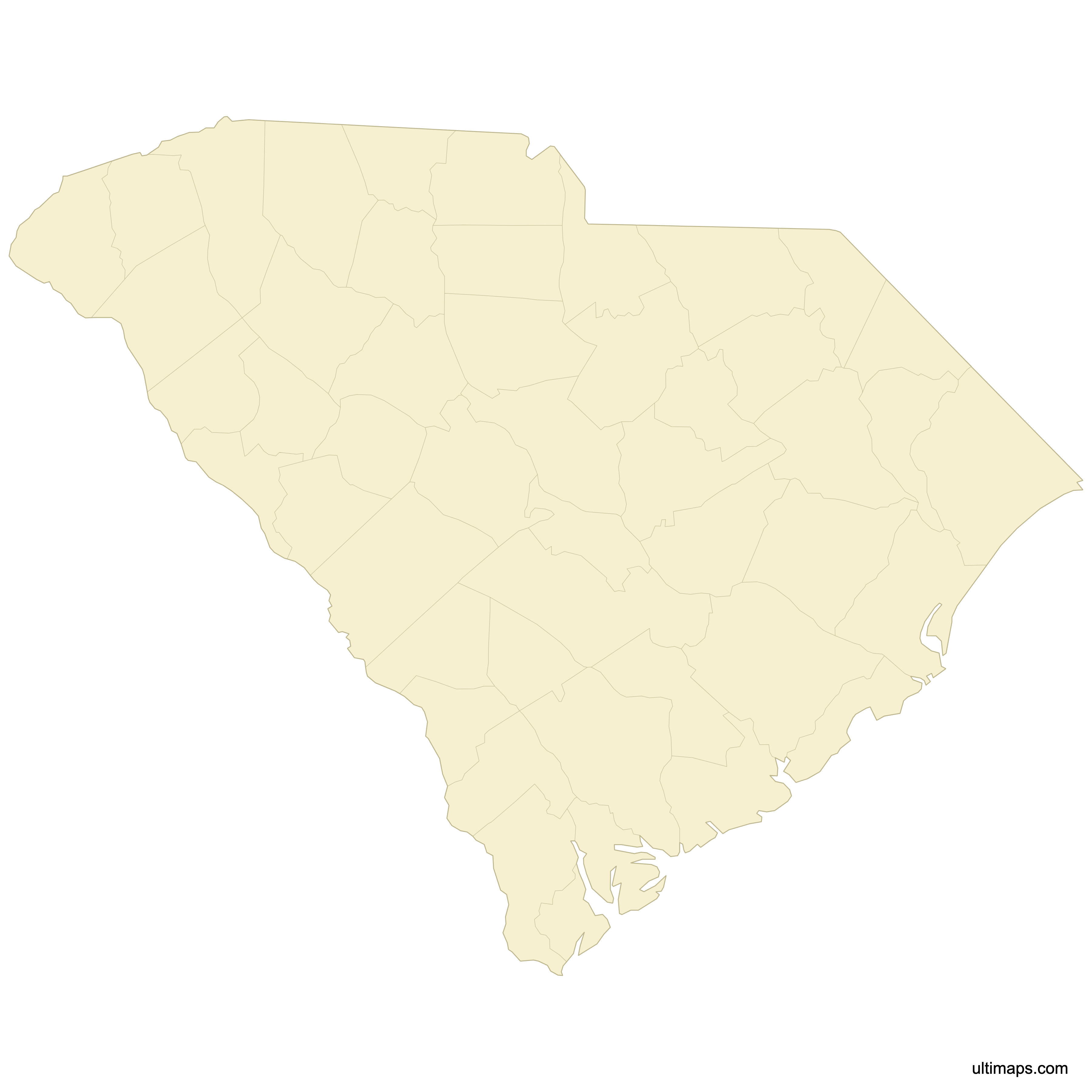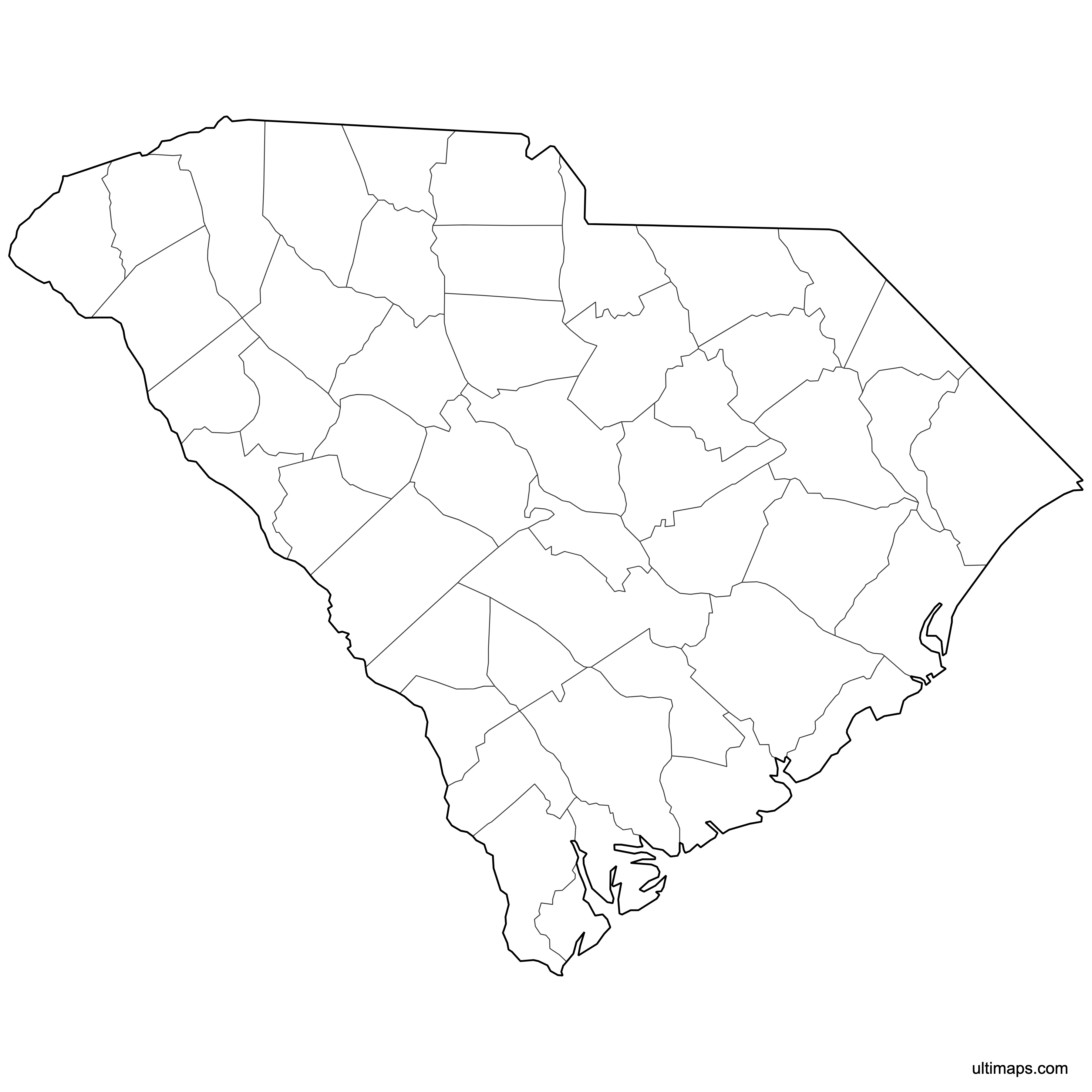 Below you can download free blank Map of South Carolina Counties in high resolution PNG or SVG formats suitable for printing or further editing. Most of the maps available in different color schemes and with different features (such as labels, roads or rivers). PNG maps are in 3600x3600px resolution and come with a transparent background.
