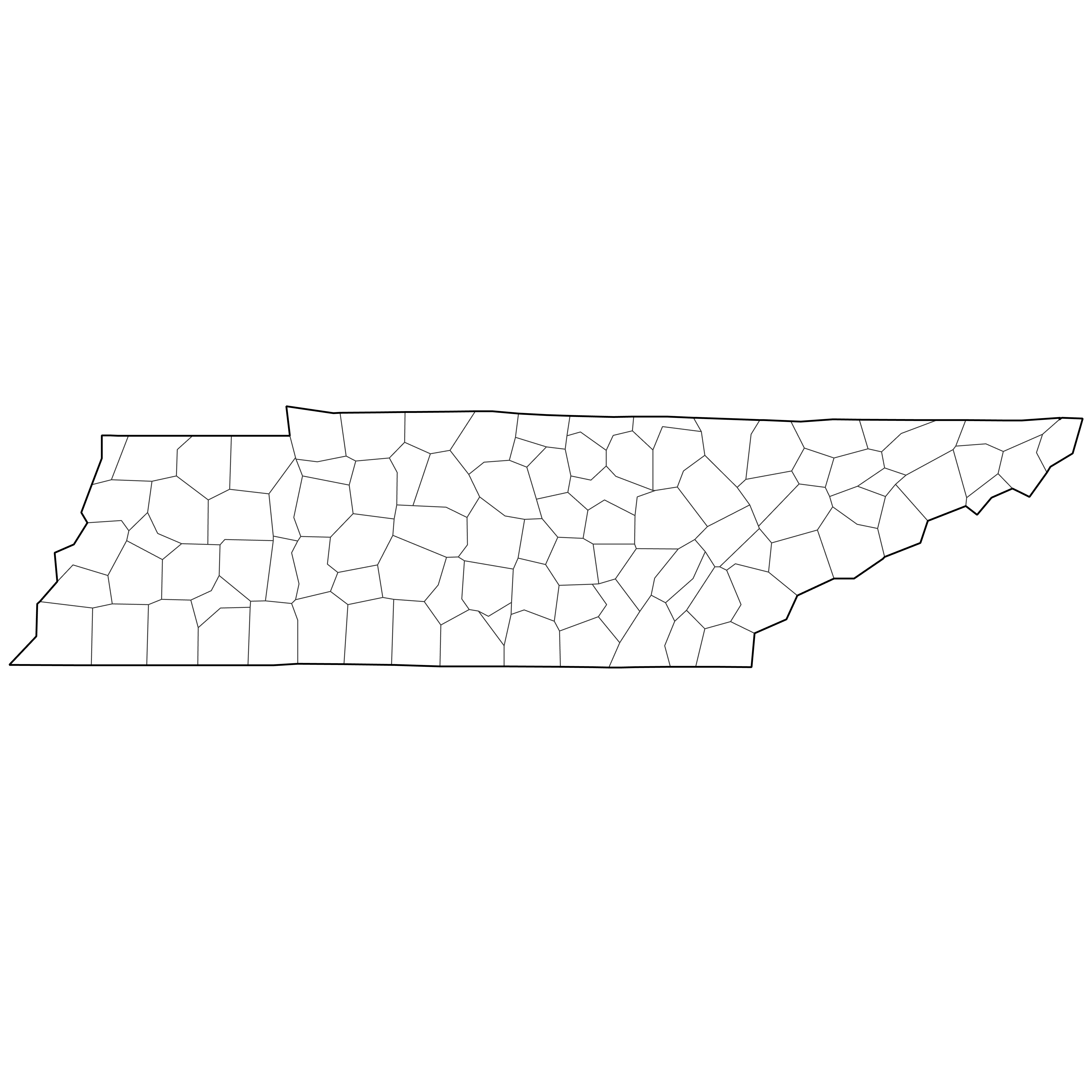 Below you can download free blank Map of Tennessee Counties in high resolution PNG or SVG formats suitable for printing or further editing. Most of the maps available in different color schemes and with different features (such as labels, roads or rivers). PNG maps are in 3600x3600px resolution and come with a transparent background.