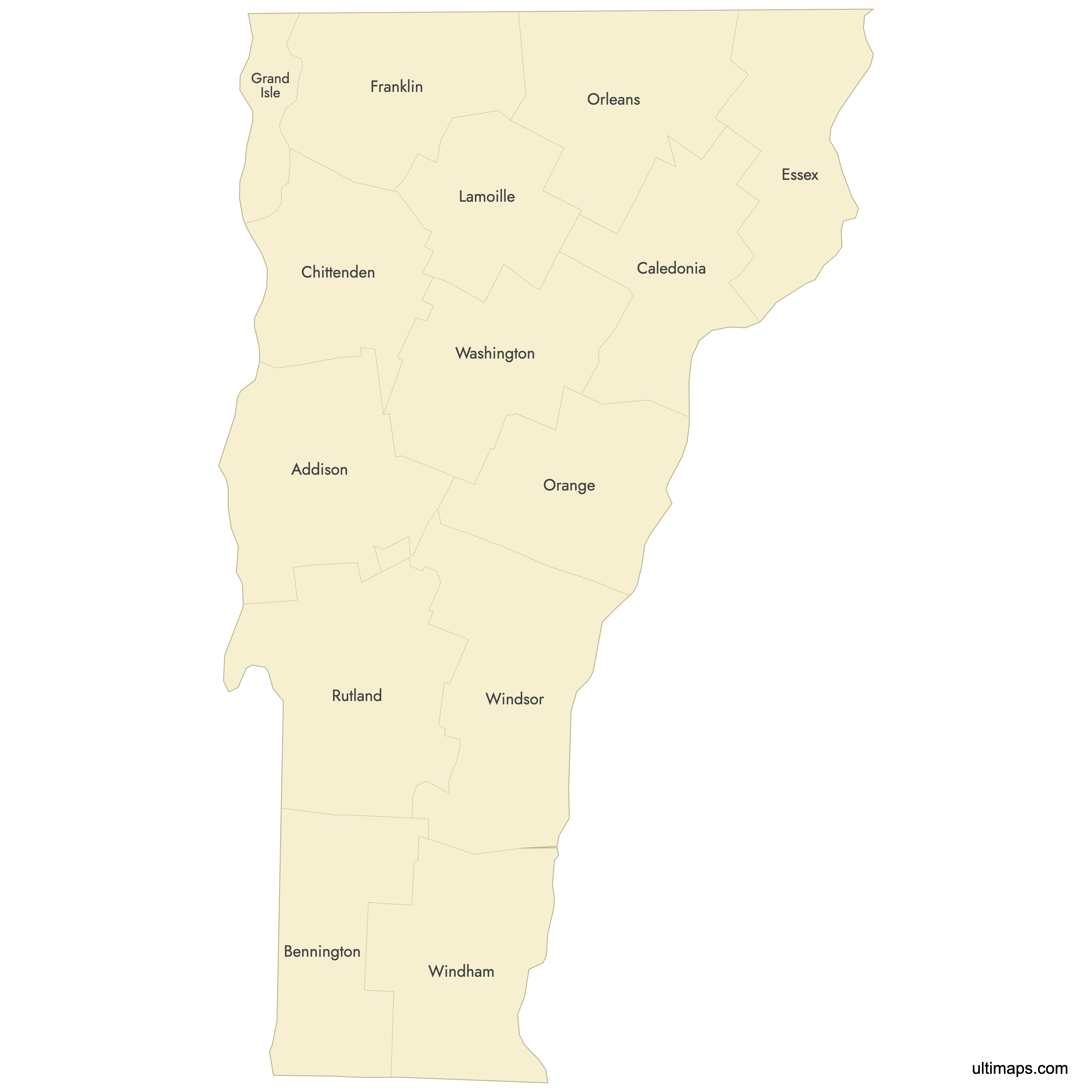 Below you can download free blank Map of Vermont Counties in high resolution PNG or SVG formats suitable for printing or further editing. Most of the maps available in different color schemes and with different features (such as labels, roads or rivers). PNG maps are in 3600x3600px resolution and come with a transparent background.