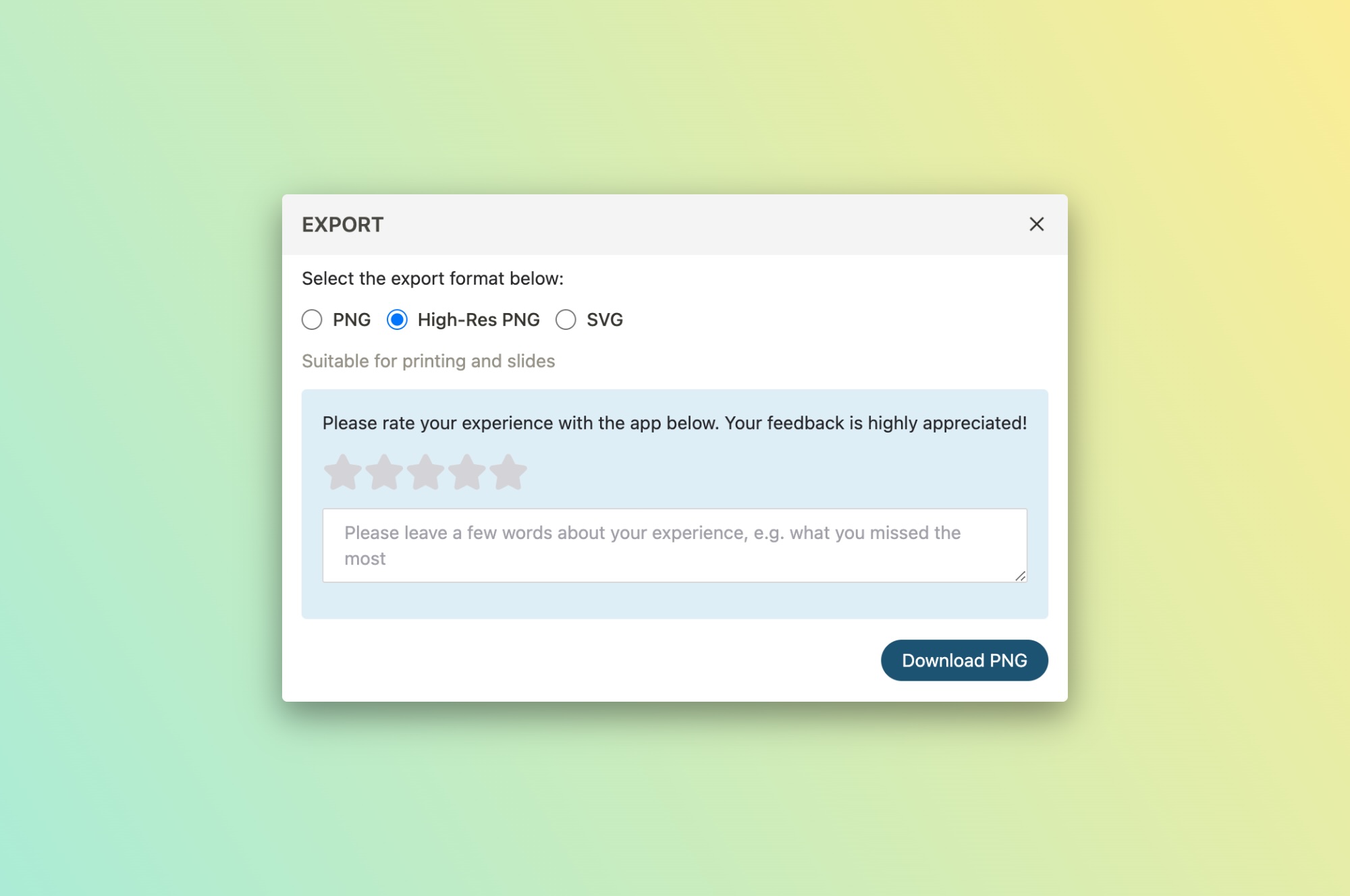 We've reworked the entire process of exporting maps, and now you can export your maps as high-quality PNG and SVG files. This is especially useful if you want to use your maps in presentations, reports, or whenever you need a printable version of your map.