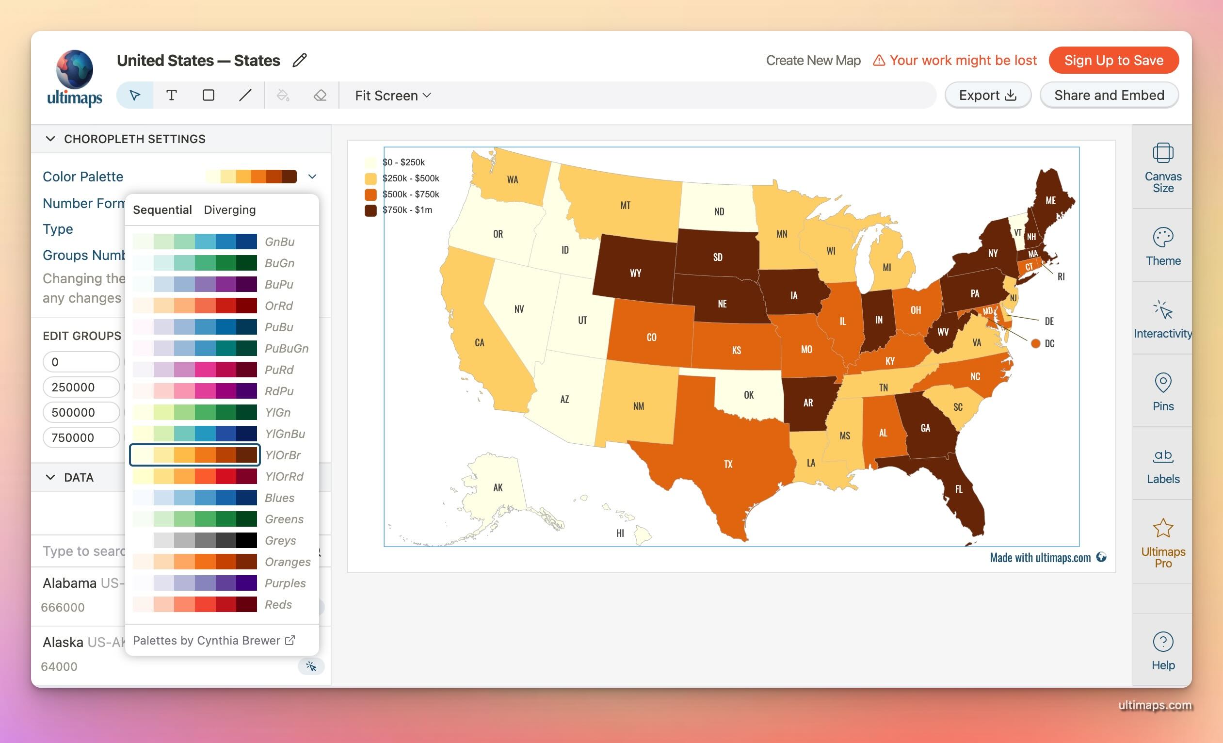 Choropleth mapping now includes palettes designed by Cynthia Brewer. These scientifically-tested color schemes improve data readability and accessibility.